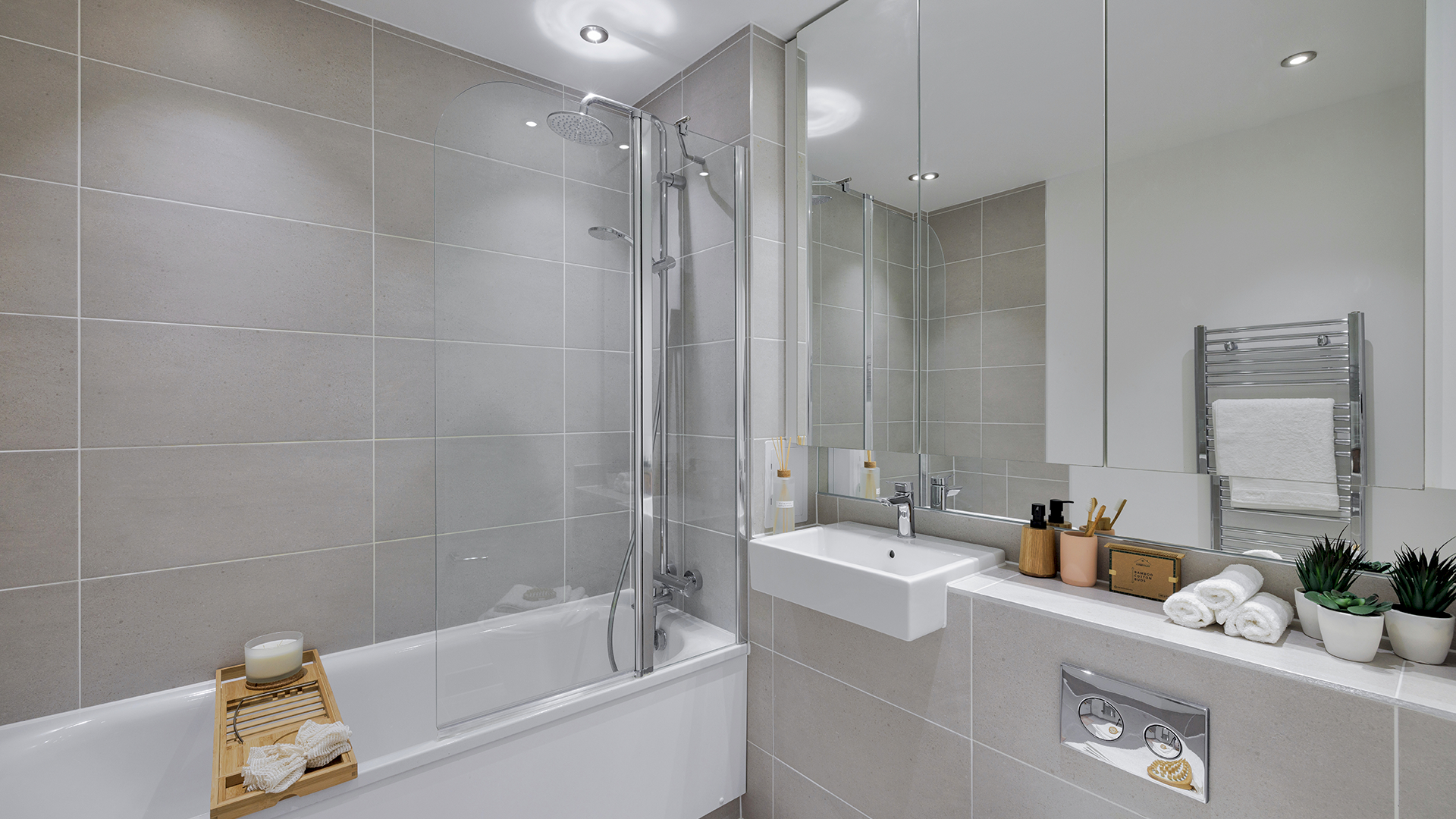 • Fully tiled bathrooms with rainfall shower over bath